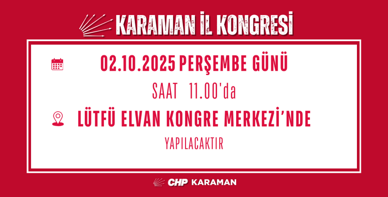 Karaman İl Başkanlığı Olağan İl Kongresi 2 Ekim Perşembe günü saat 11.00'da Lütfi Elvan Kongre ve Fuar Merkezinde gerçekleştirilecektir. pic.twitter.com/5PqSYoOgG0